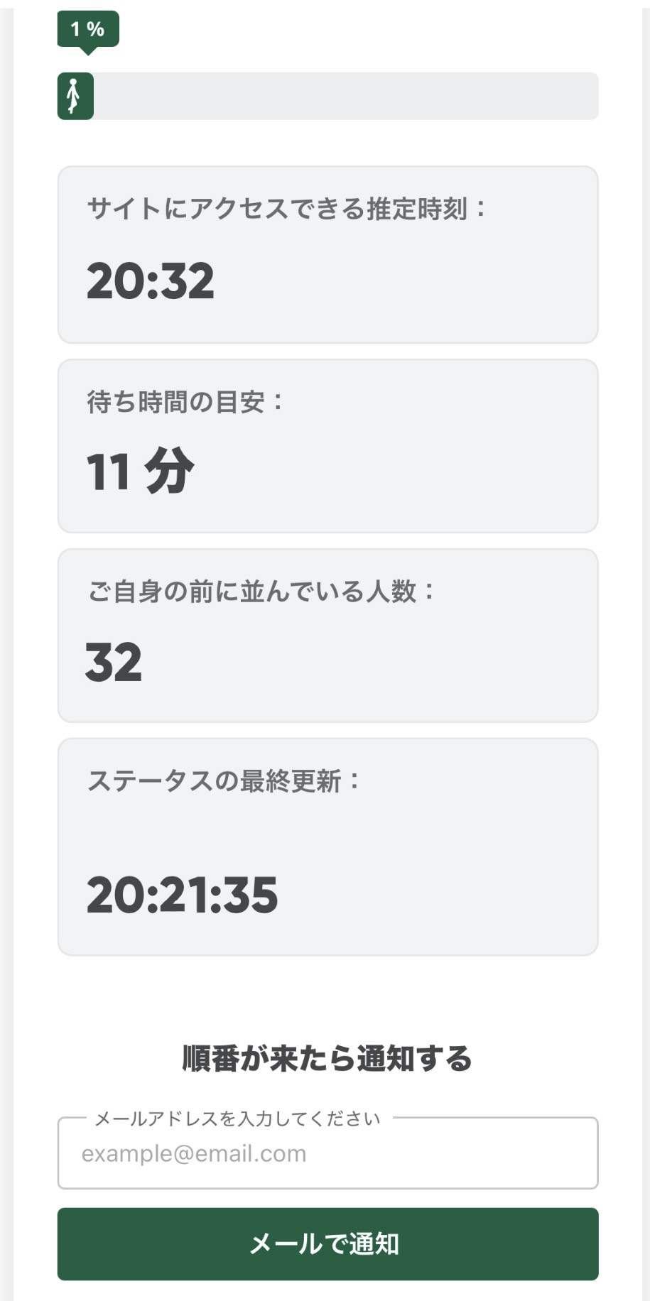 順番になってから10分を過ぎてアクセスいただけなかった場合は、最初から並びなおし(待ち時間が最初から)となります。